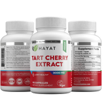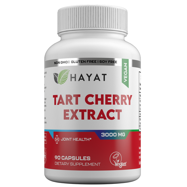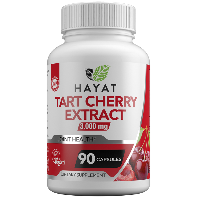 Hayat Vitamins' Tart Cherry capsules are made with 3000 mg of potent extract (10:1) tart cherry powder. Tart cherry, also known as sour cherry, is used for muscle soreness after exercise, improving exercise performance, gout, high blood pressure, insomnia, collagen building, and other conditions. Our Tart Cherry capsules provide some of the same benefits as Tart Cherry juice without the sugar, carbohydrates or calories.